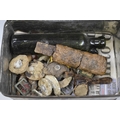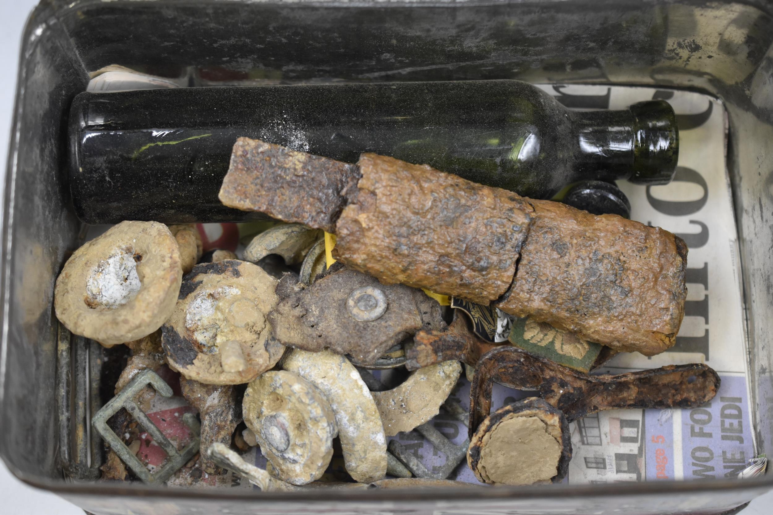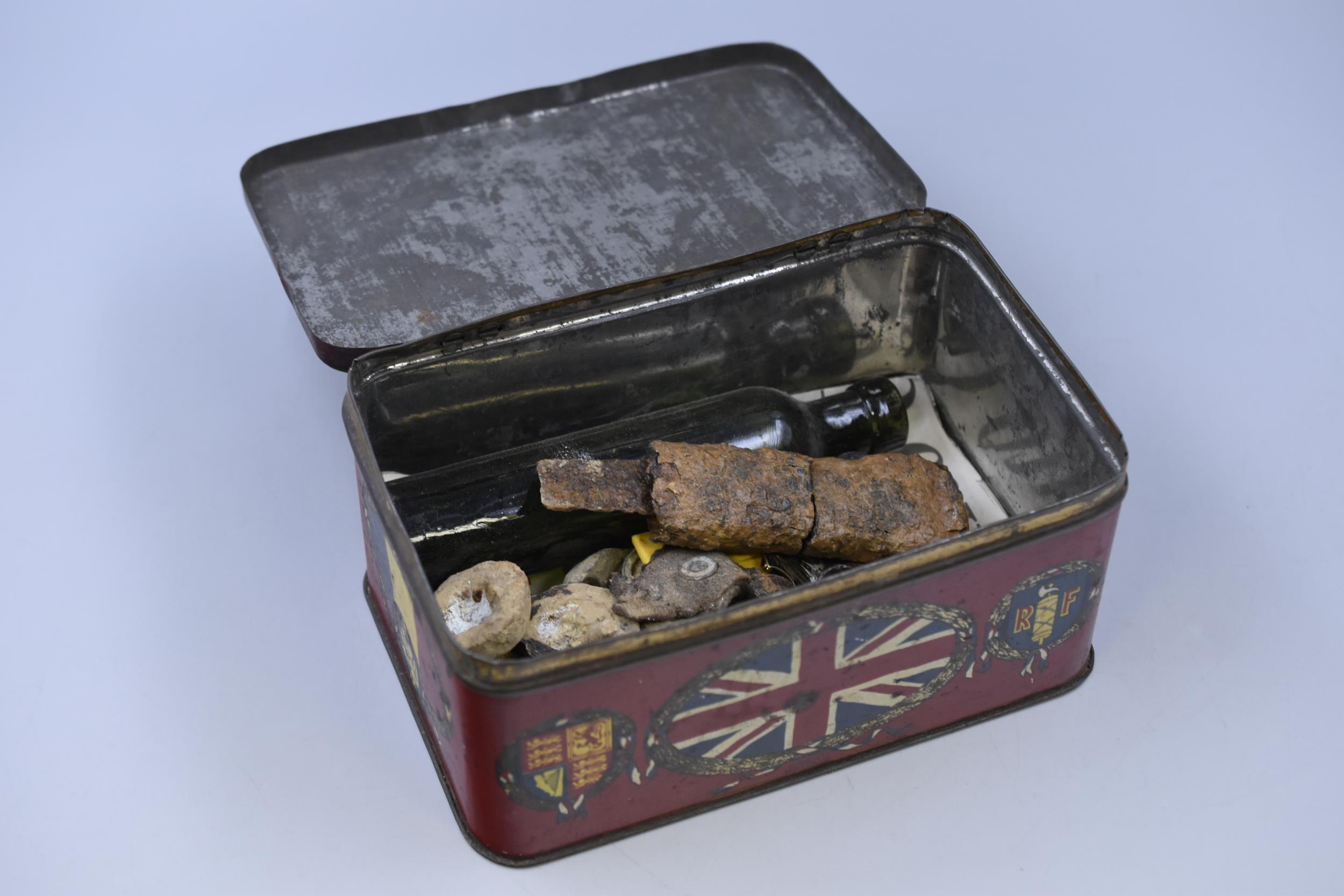 Vintage Metal Tin Containing Metal Detecting Finds Including Inert Bullets, Glass Bottle and More
