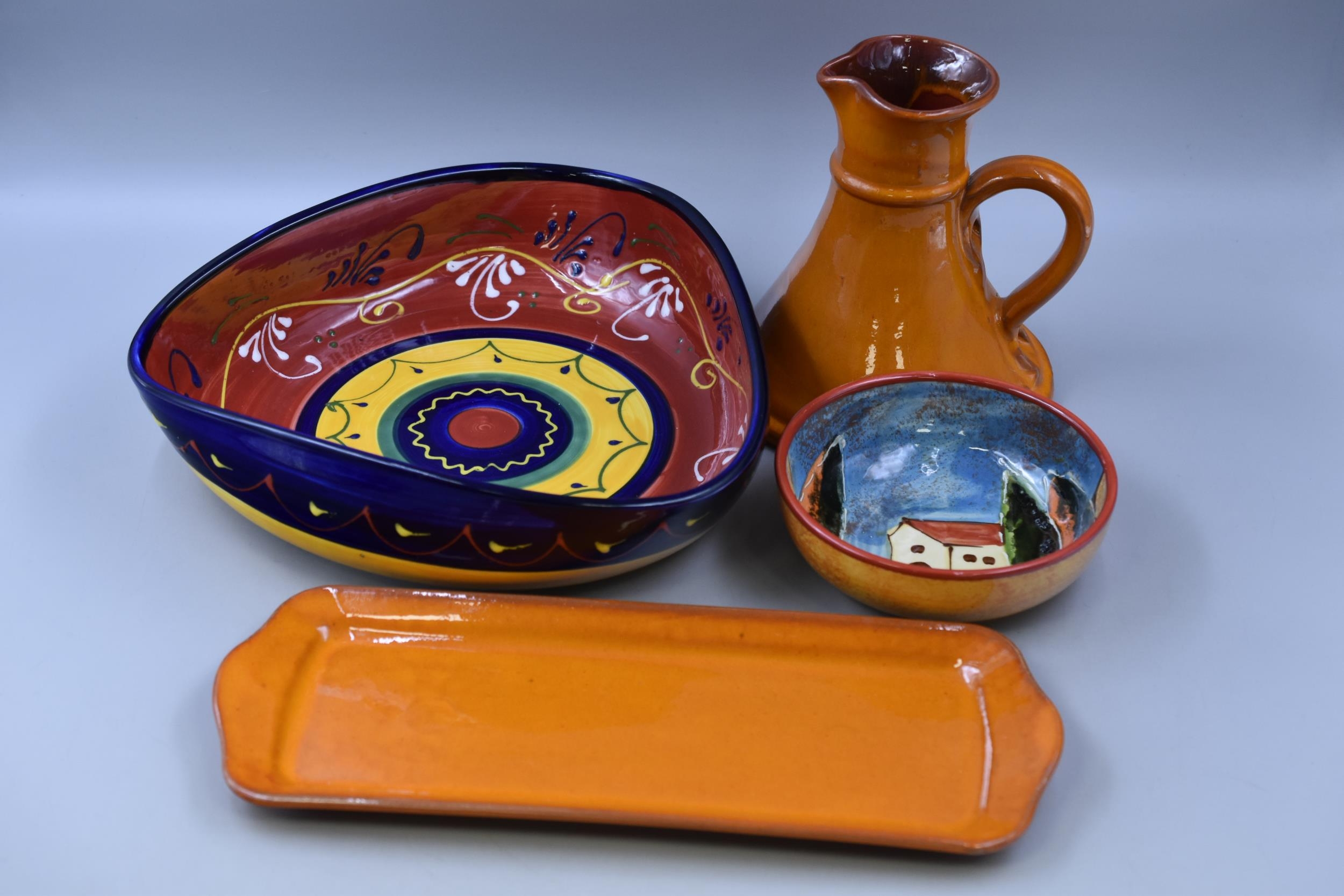 Four Pieces of Spanish Style Pottery To Include Jug and Serving Plate Set, Serving Bowl, And Hacienda Bowl. Serving Bowl Is Approx 32cm Long