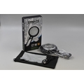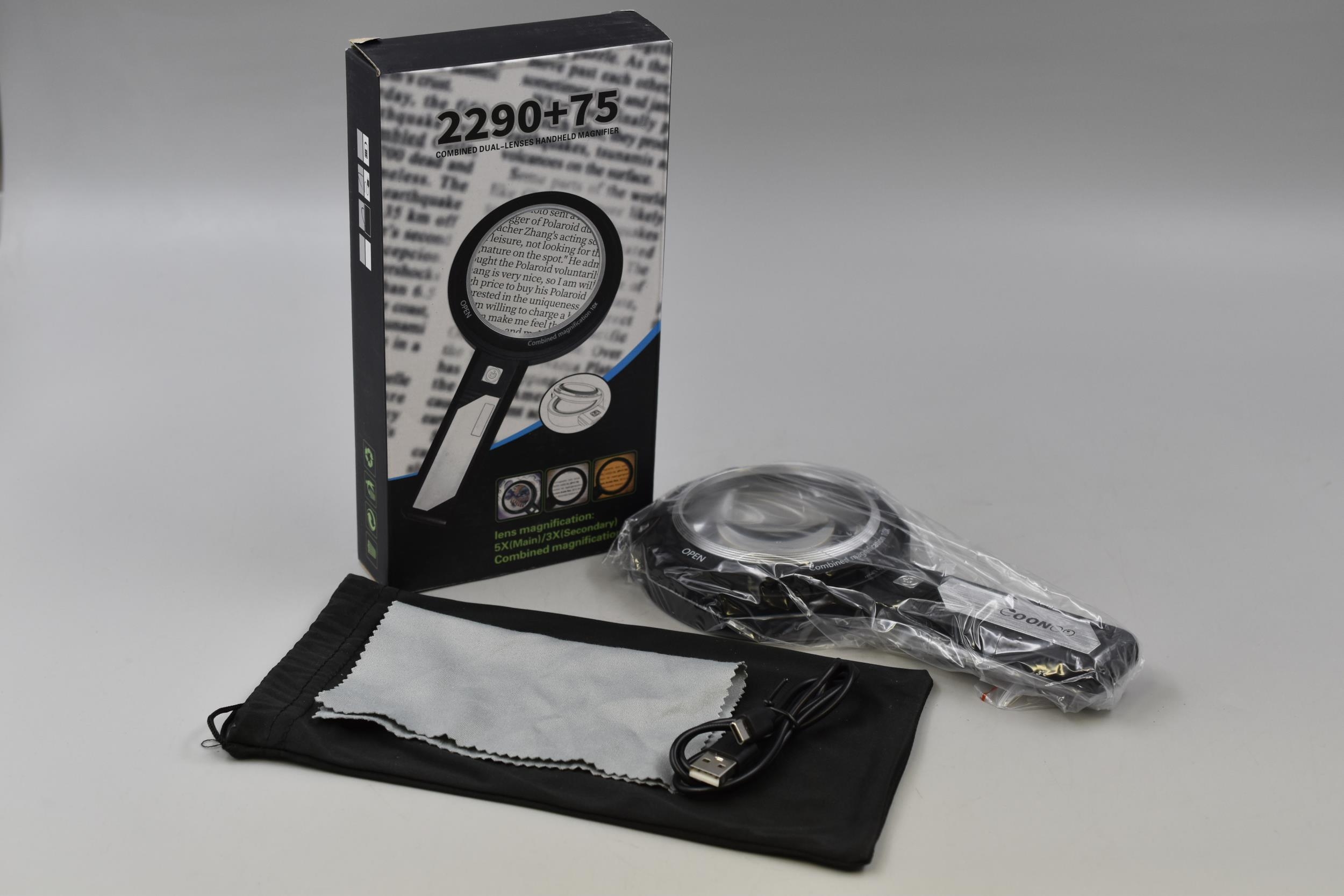 Brand New Boxed Rechargeable Combined Duel Lens Magnifier 5X Main and 3X Secondary Magnification Complete with Built in Light and Storage pouch.