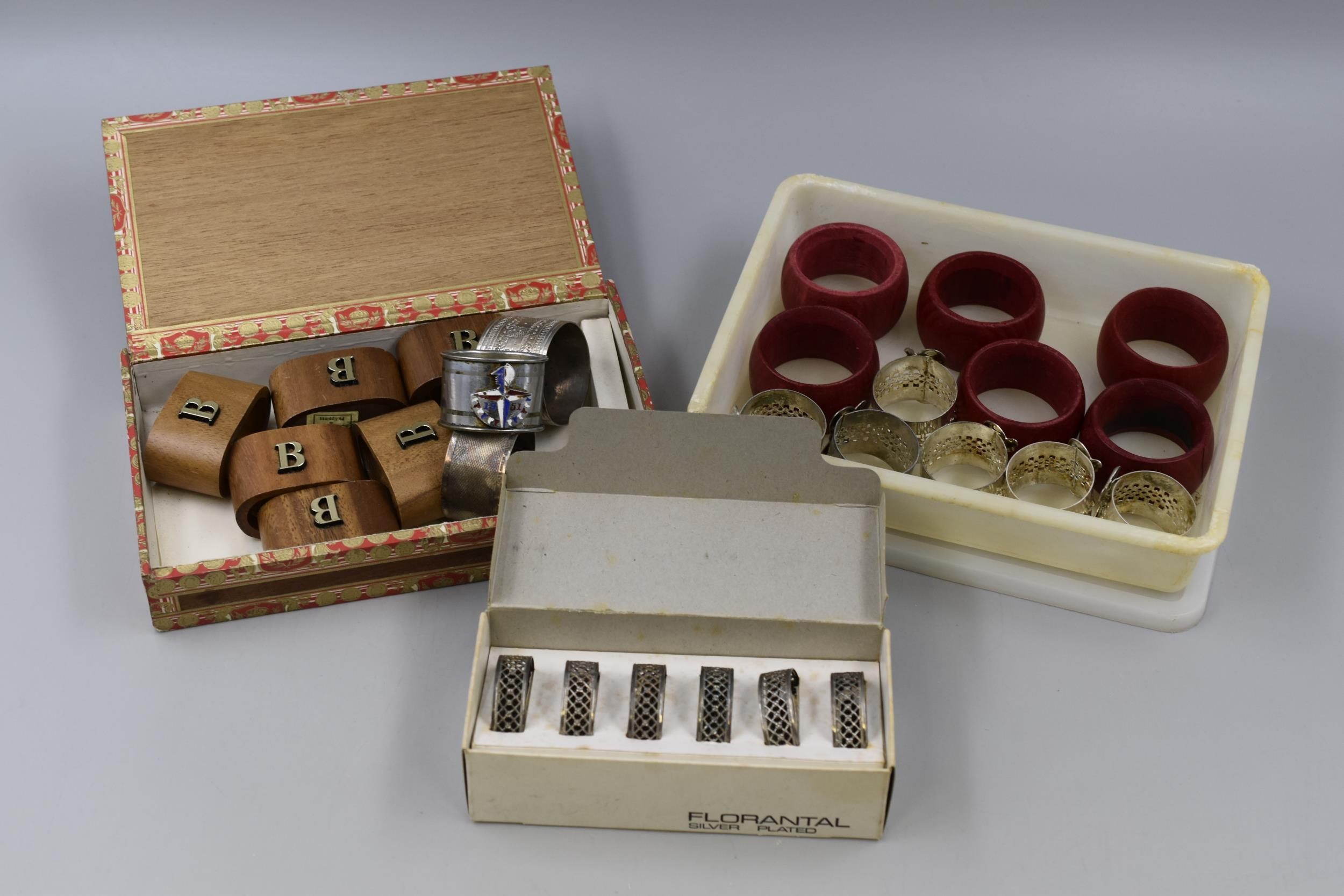 A Selection of Napkin Rings To Include Florantal Silver Plated, Set of Mid Century Wooden, And More